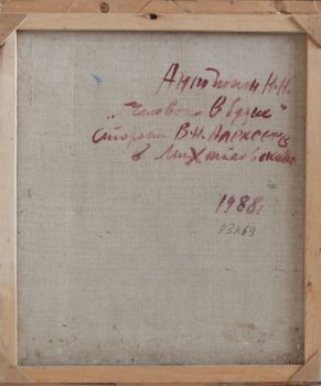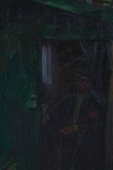 Человек в будке.Сторож В.Н. Алексеев в Михайловском. 1988г. Холст, масло. 83х69